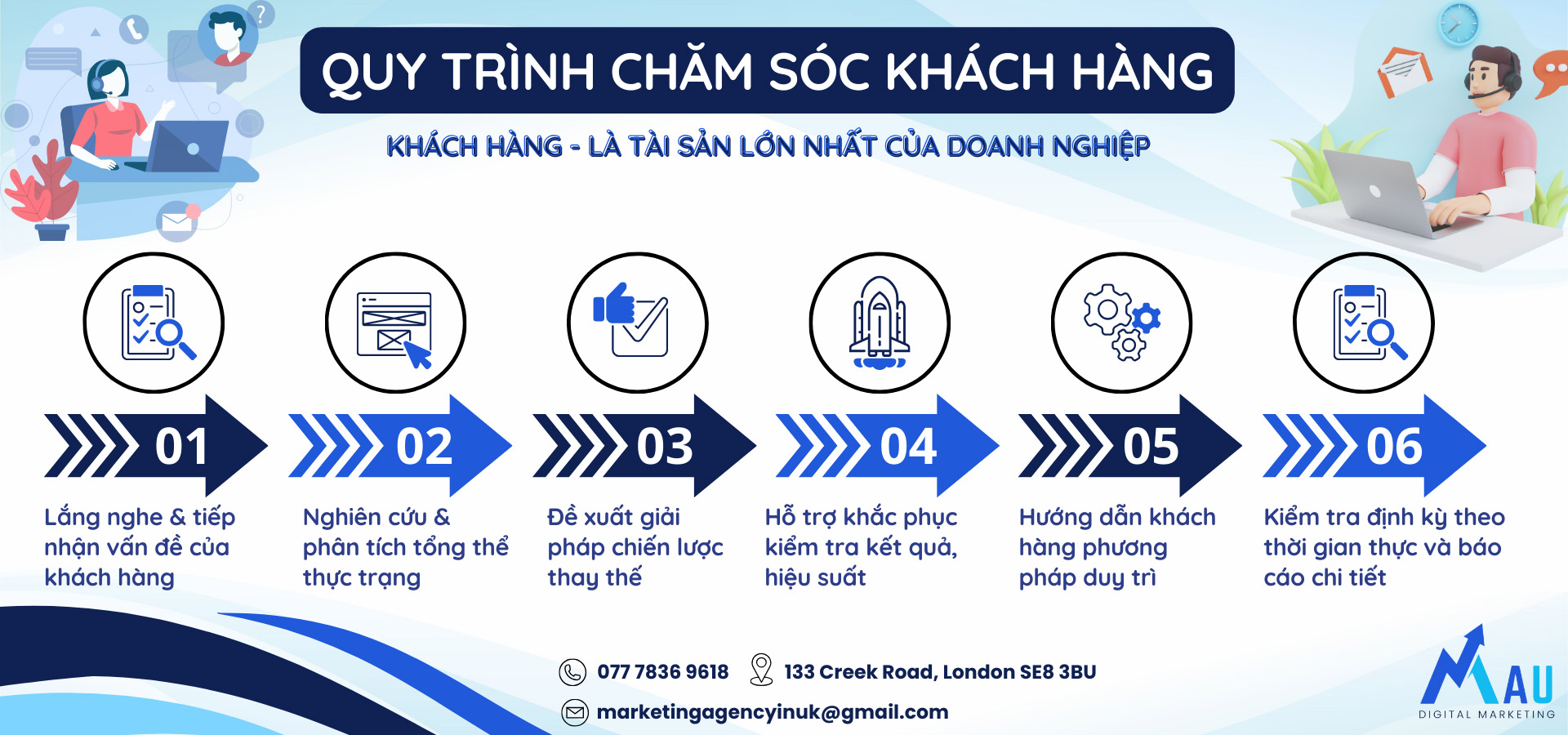 MAU Agency được thành lập bởi nhóm chuyên gia, kỹ thuật viên có kinh nghiệm và hướng đến phân khúc khách hàng là những chủ doanh nghiệp SMEs, chủ các cơ sở dịch vụ làm đẹp: Spa, Nails Salon, các nhà hàng và nhà cung cấp dịch vụ khác dành cho cộng đồng người Việt Nam tại Vương Quốc Anh.